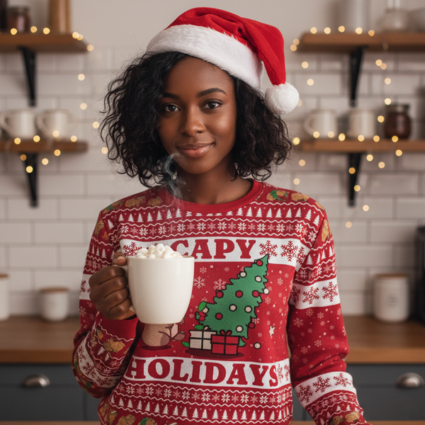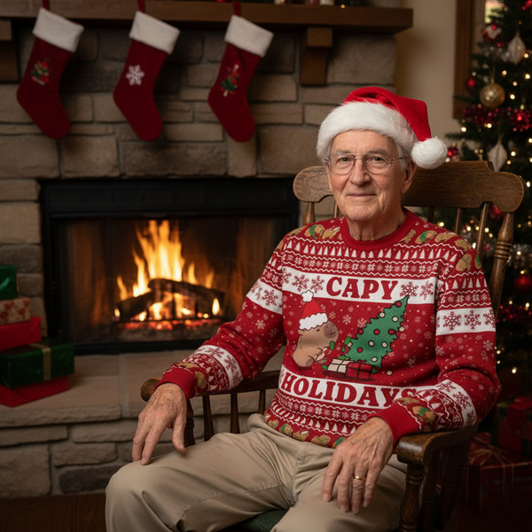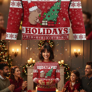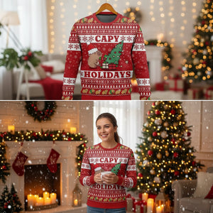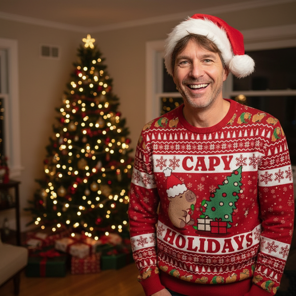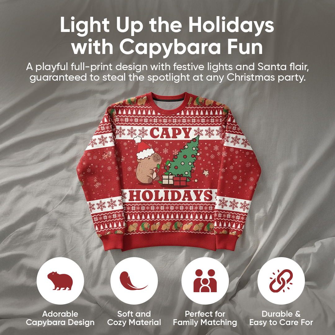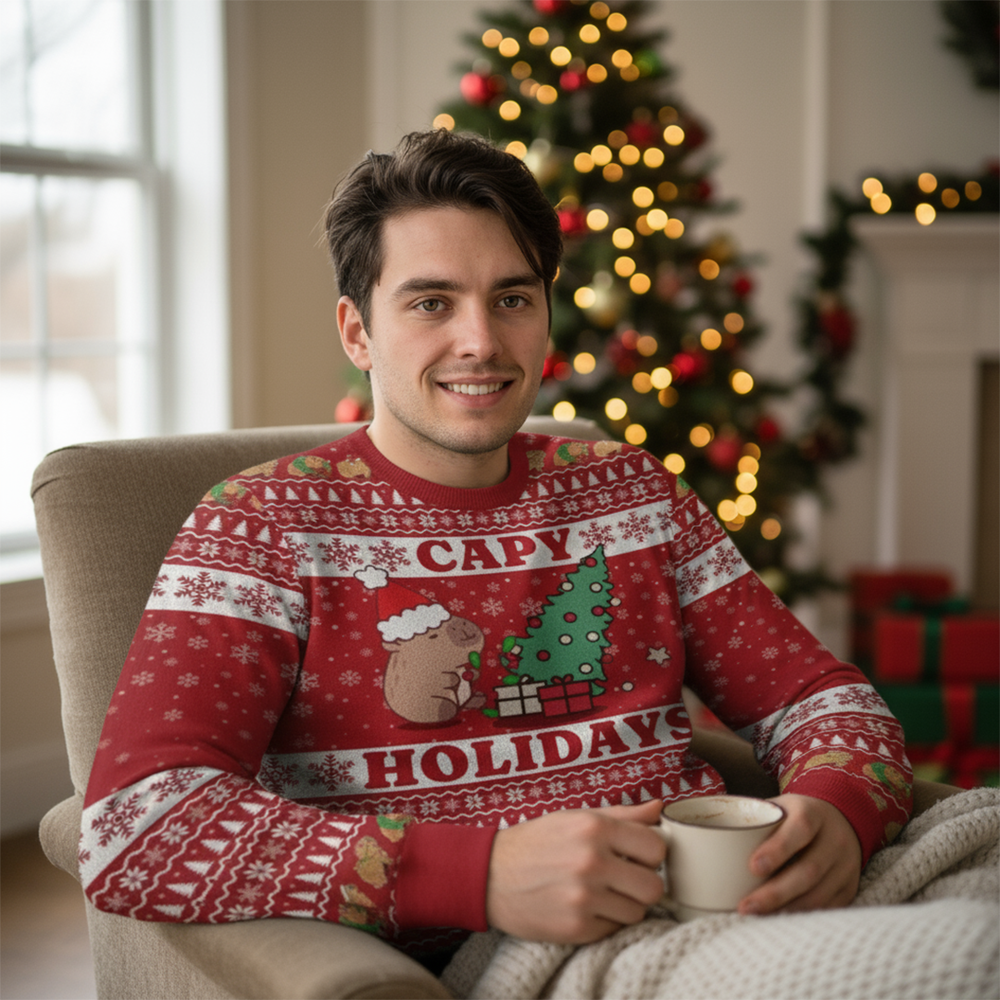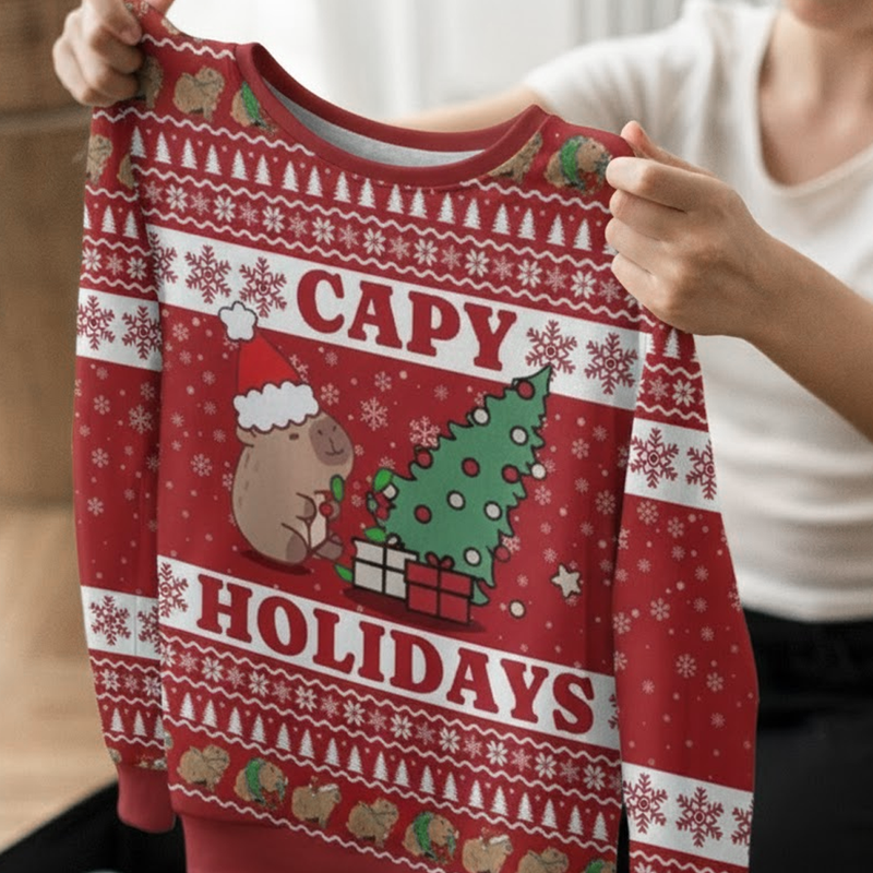 (Capture the perfect “Capy Christmas” moment with a sweater made for smiles and social posts.)