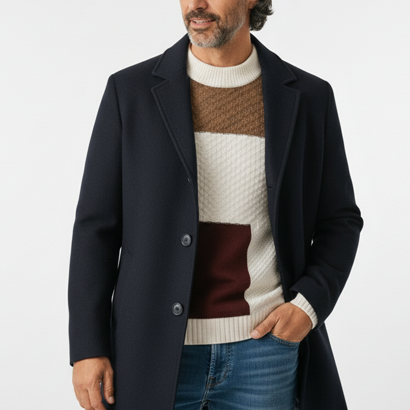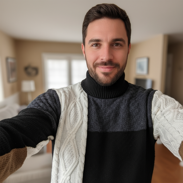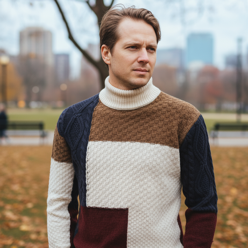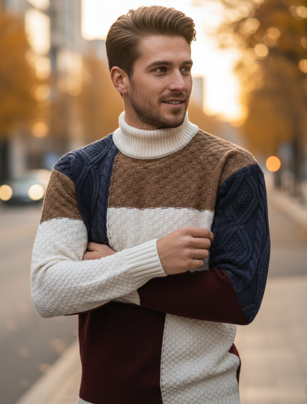 A premium mock-neck sweater with a modern patchwork knit. Designed for warmth, softness, and a slim silhouette that's easy to dress up or down.