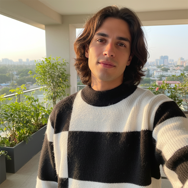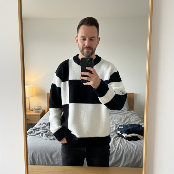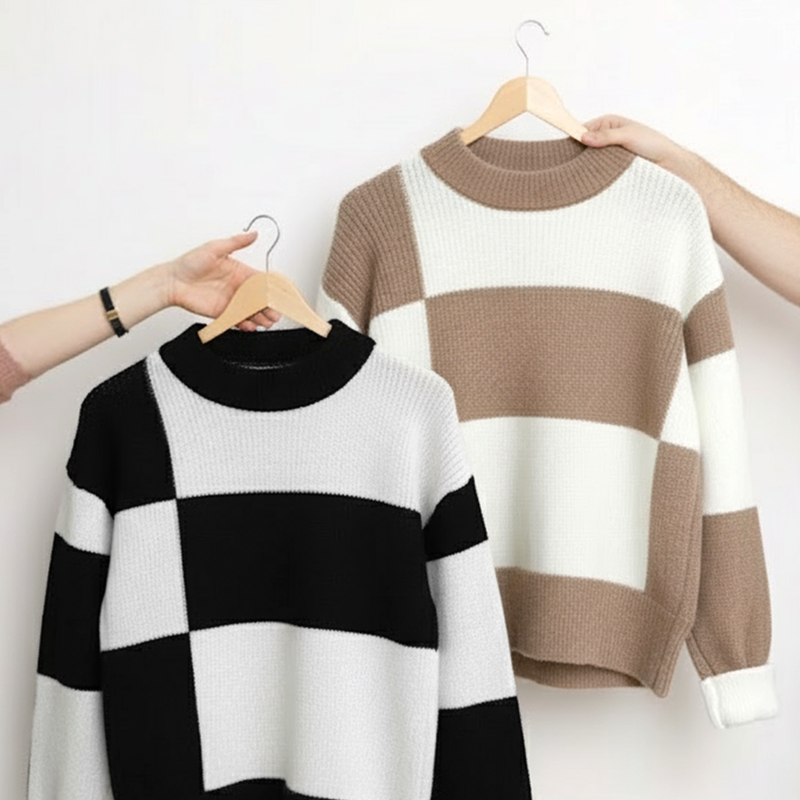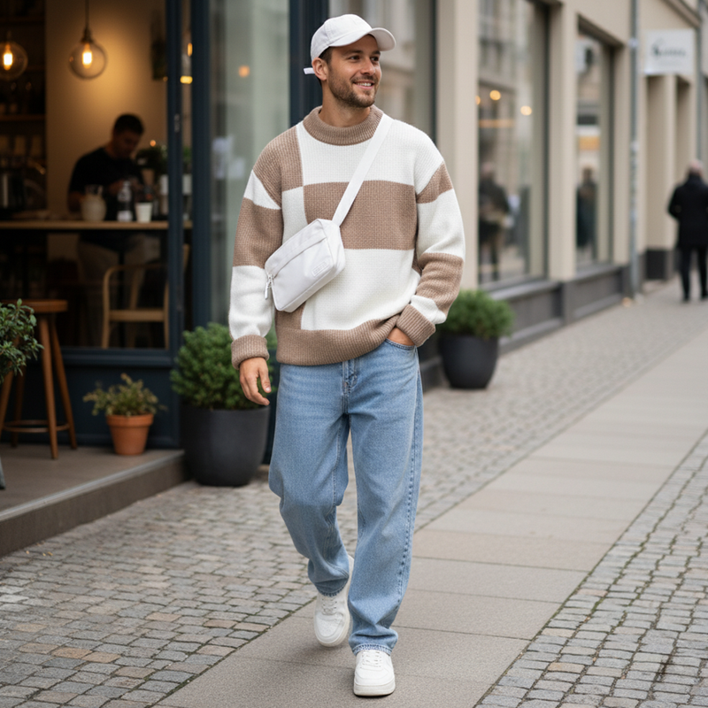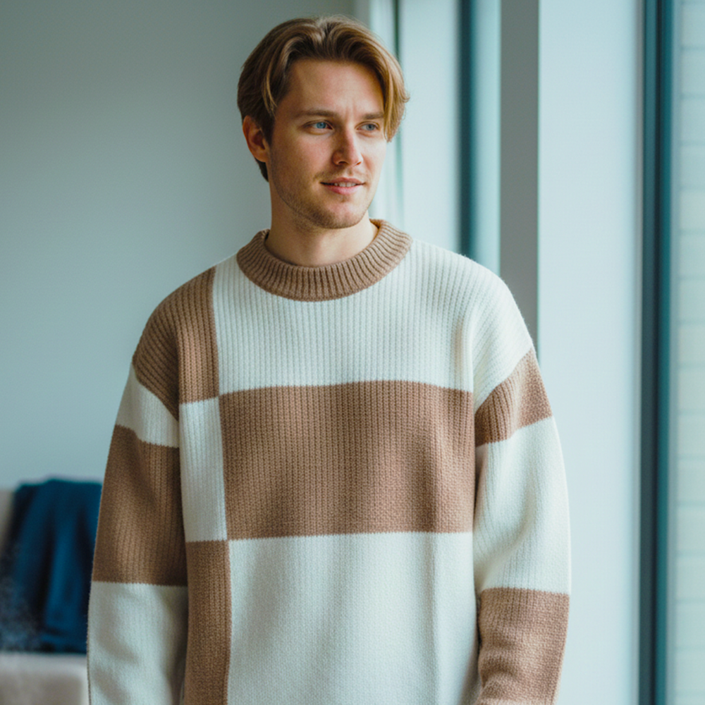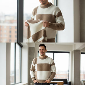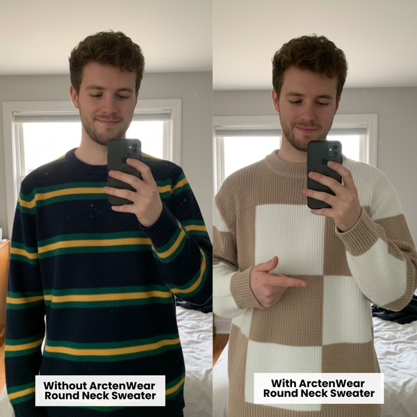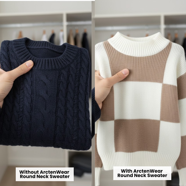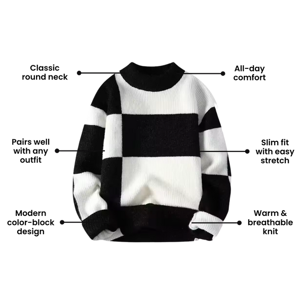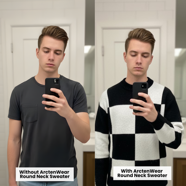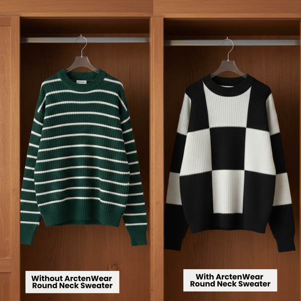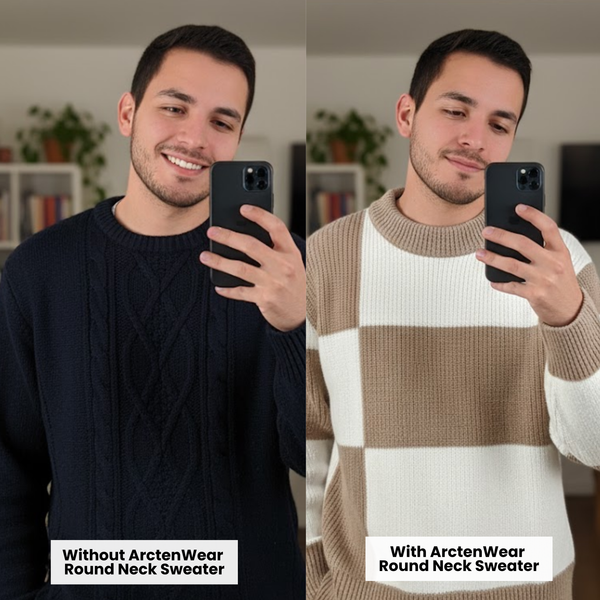 The ArctenWear Round-Neck Sweater is a structured color-blocked knit made for cool days and sharp fits. A soft, breathable yarn blend keeps warmth without bulk while the slim cut creates a clean line.